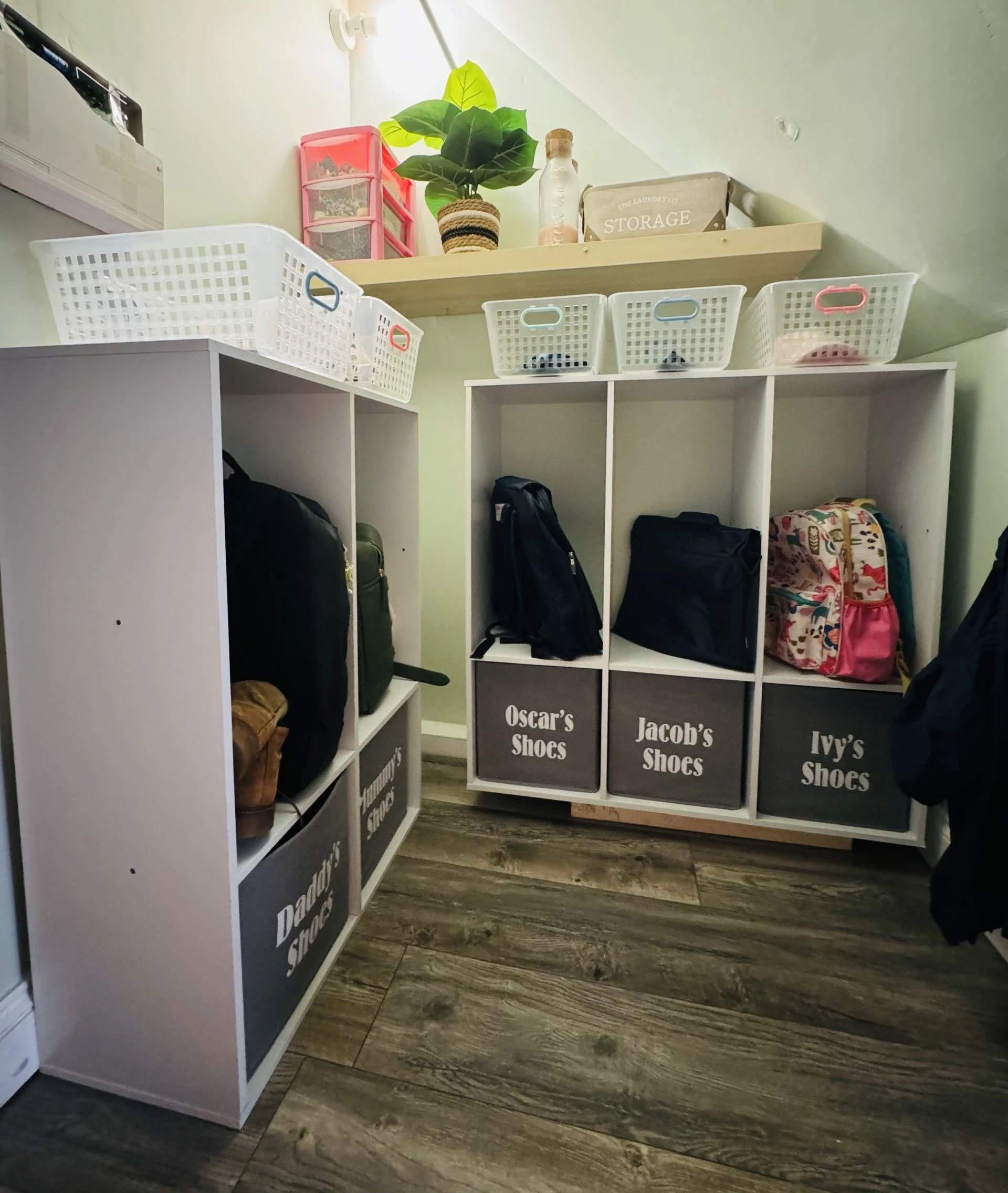 I sourced these storage units from Homebase. My original thought was to order them from Ikea but luckily I measured the space first as the Ikea Kallax units were too big for this area. I found them in Homebase, ordered online and did a seamless click and collect. When building, I left one shelf out so there was space for the school bag to hang which I have since attached hooks for. Now the children have a space for their bag, shoes and coat which not only tidies up their school essentials and utilises an awkward, small space, it has given them a bit of independence before and after school as they can pick up and put away their bag, coats and shoes. Well, that is the idea anyway!