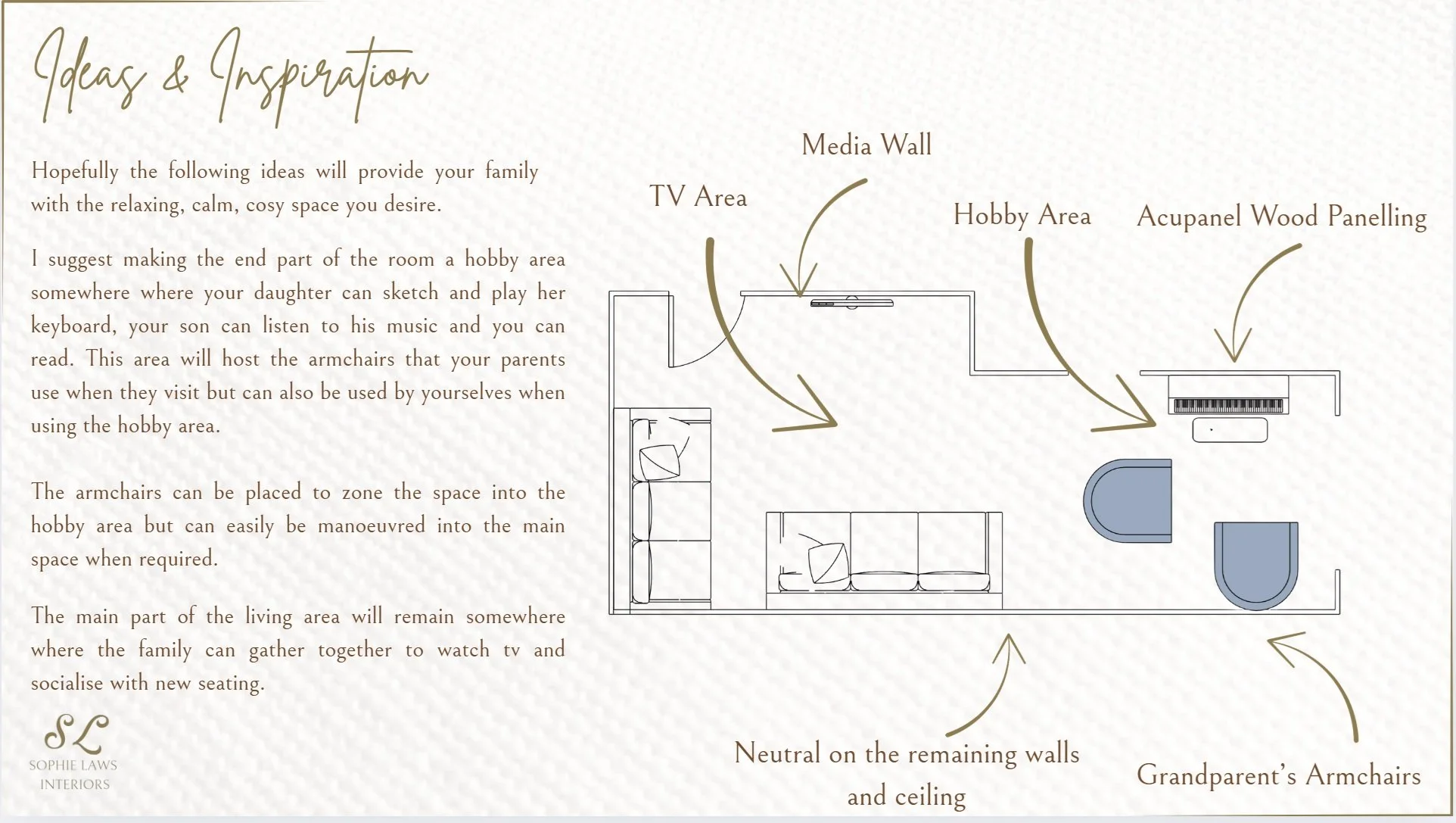 A family asked me to help with their awkwardly shaped living room which they felt was just a long tunnel and they struggled with furniture placement. They wanted it to be a cosy, comfortable space where they could socialise and watch TV but also be somewhere for the children's hobbies. I zoned the room into two spaces; a TV area and a hobby area